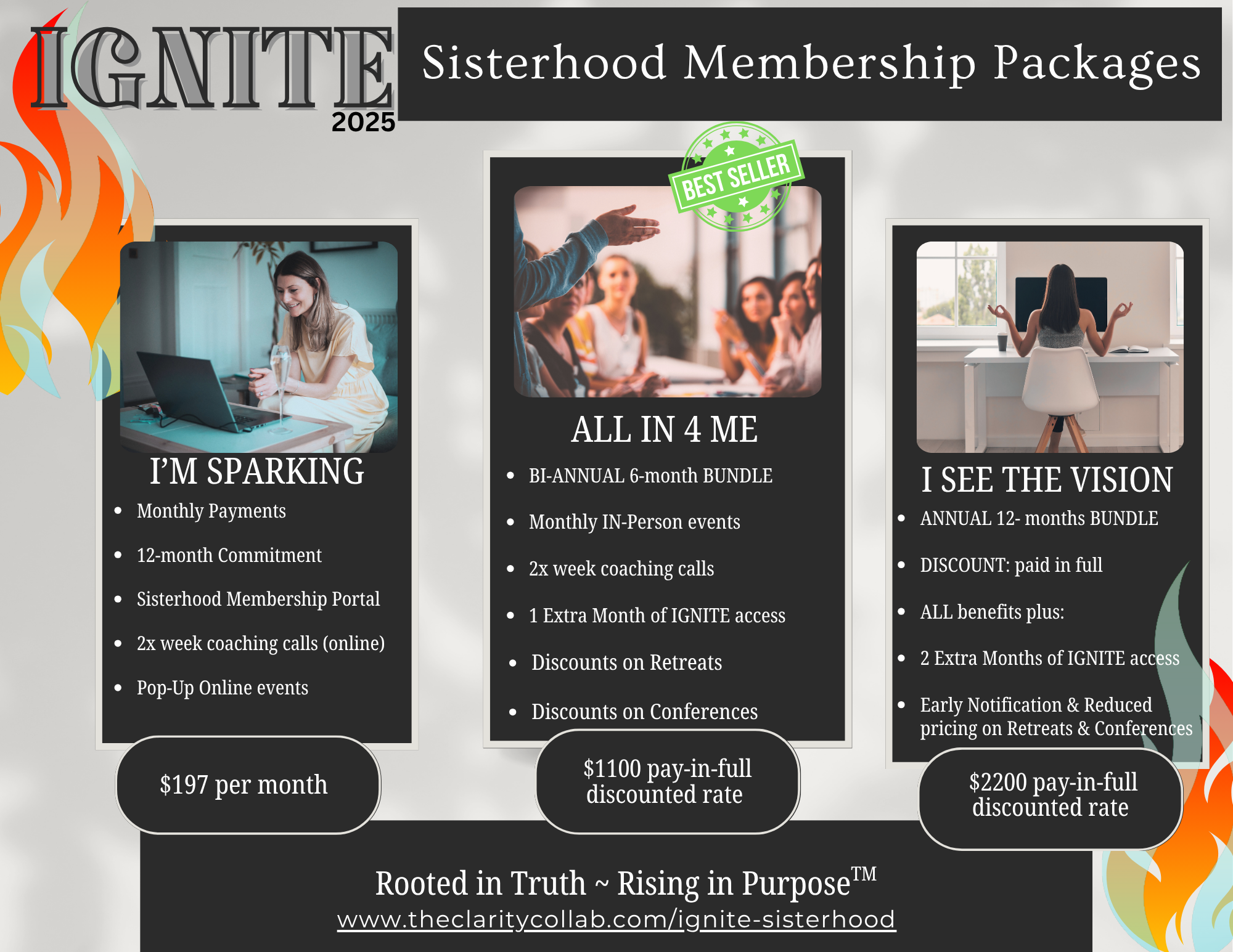 Once you decide which membership package fits your need, you will be invited to join the IGNITE Sisterhood Membership Portal for exclusive programs & trainings.